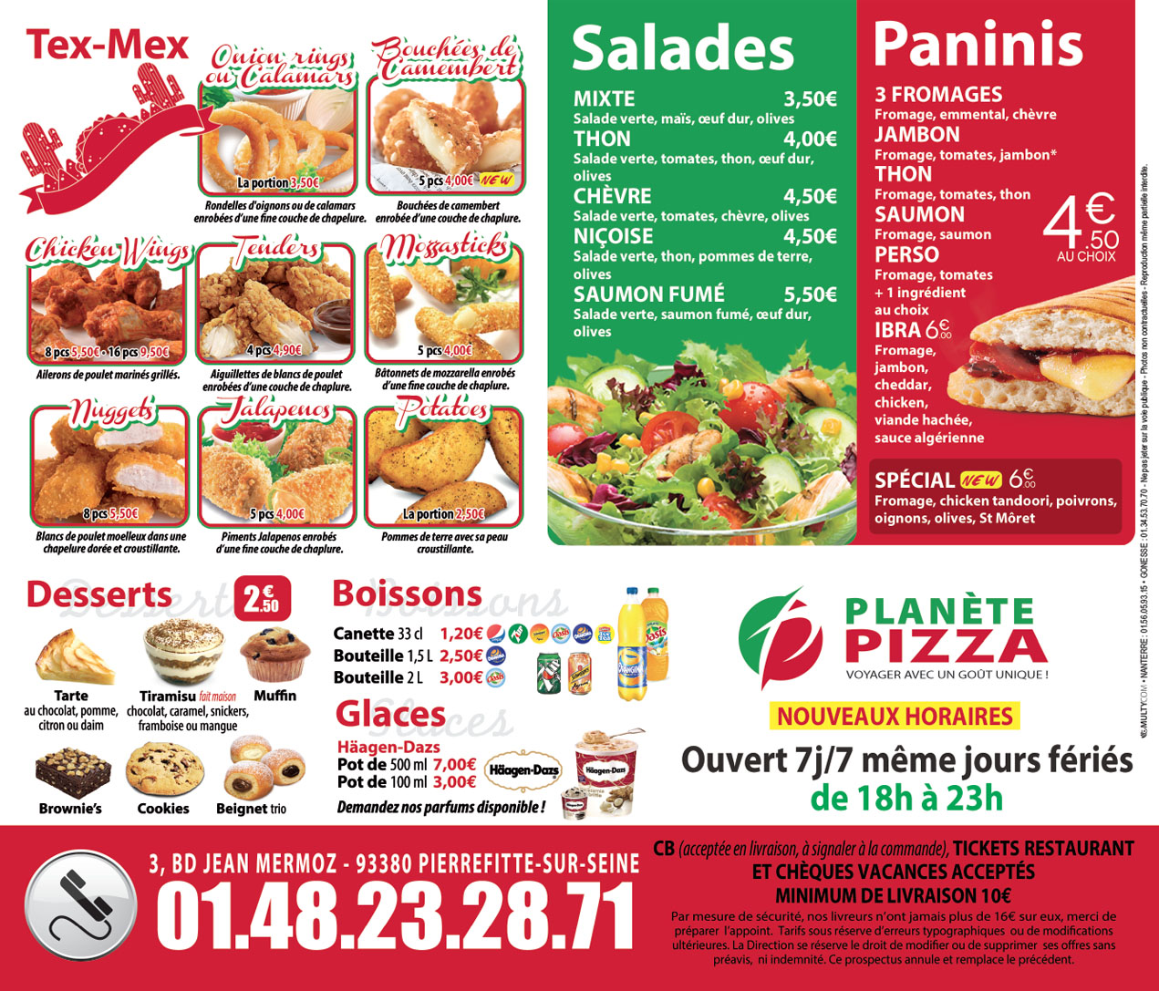 Par mesure de sécurité, nos livreurs n'ont jamais plus de 15€ sur eux, merci de préparer l'appoint. Tous nos produits étant préparés à la main lors de votre commande le délai de livraison peut être rallongé en cas de forte affluence, de problèmes techniques ou de contraintes climatiques. Tarifs sous réserve d'erreurs typographiques ou de modifications ultérieures. La Direction se réserve le droit de modifier ou de supprimer ses offres sans préavis, ni indemnités.